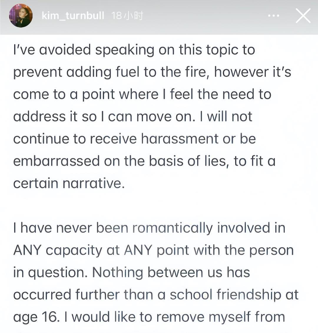 针对外界的诸多猜测,金直接选择在 ins 上正面硬刚。她说:“我一直避免谈论这个话题,以免火上浇油,但现在我觉得有必要谈谈这件事,这样我才能继续前进。我不会再因为谎言而遭受骚扰或羞辱,也不会为了迎合某种叙事而继续这样做。”我从未与当事人有过任何形式的恋爱关系。我们之间除了16岁时的校园友谊之外,再无其他。为了所有相关人员,我想从这场持续不断的讨论中脱身,并澄清事实。”